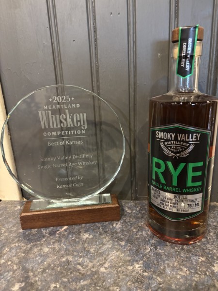 Our Rye Single Barrel Whiskey was awarded Best of Kansas at the 2025 Heartland Whiskey Competition, presented by Kansas Corn. This recognition puts Smoky Valley Distillery among the top whiskey producers in the state and validates what our head distiller has known from the start — this is an exceptional rye.